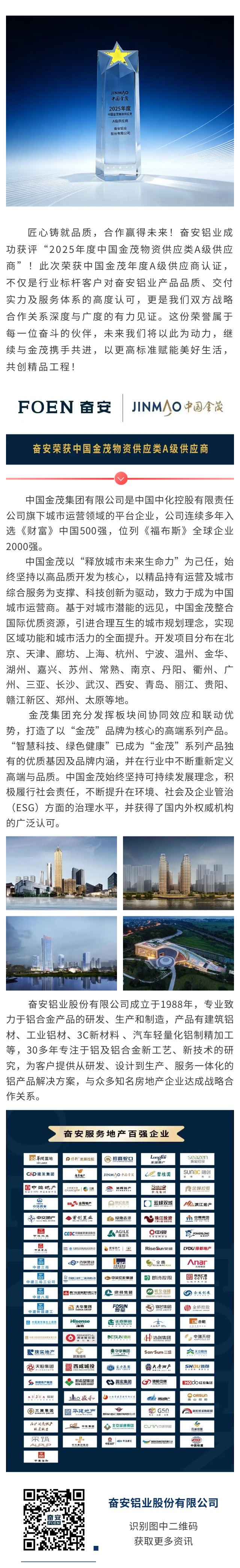 【喜報】奮安鋁業榮獲2025年度中國金茂物資供應類A級供應商