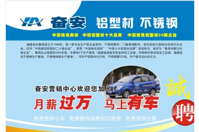 福建奮安集團成立于1988年,是一家專業生產鋁合金型材、不銹鋼管材、門窗幕墻配件、密封膠的大型綜合性現代化企業,位列“中國建筑鋁型材二十強企業”,獲得“中國馳名商標”“中國十大鋁型材品牌”榮譽稱號,被評為“最具創新與價值企業”。集團總占地面積2000多畝,共擁有4個生產基地(福建福清奮安鋁業科技工業城、河南焦作奮安鋁業工業城、福建奮安不銹鋼生產基地、不銹鋼閩侯生產基地),可年產鋁型材30萬噸、不銹鋼管5萬噸,年產值可達50多億元。