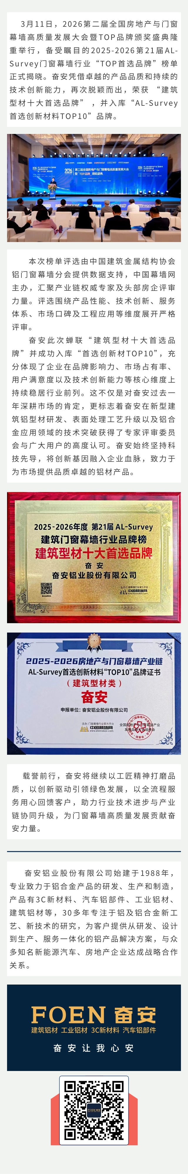 再次加冕!奮安蟬聯(lián)“建筑型材十大首選品牌”并入庫(kù)“AL-Survey首選創(chuàng)新材料TOP10”品牌