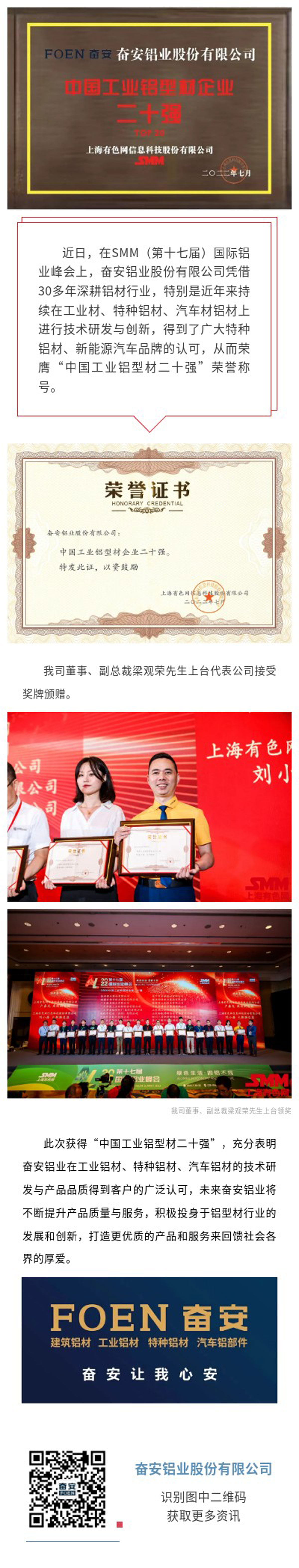 喜訊 | 奮安鋁業榮膺中國工業鋁型材企業二十強