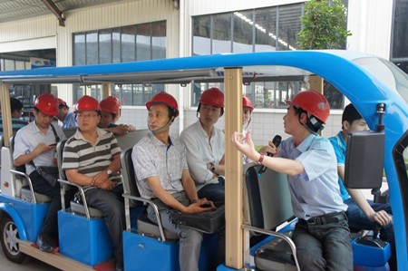 地產采購經理人在觀光車上巡視奮安集團各個車間
