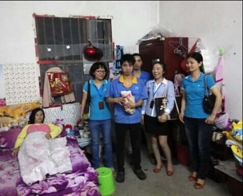 (工會主席、人資總監(jiān)陳凌芹攜噴涂車間副主任李毅、行政主管陳學碧、人資主管李慧英將善款送至周龍本人手中)