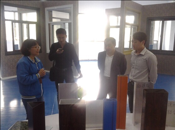 (陳主席在體驗(yàn)中心為陳主任等老師一行介紹奮特色鋁單板、鋁模板)